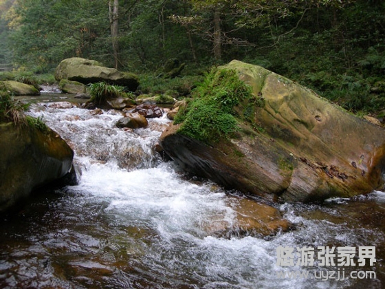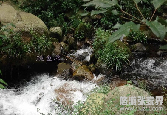 跳魚潭:位于紫草潭下游。若把金鞭溪比作絕代麗人,兩潭則是其一雙動人的眼睛。跳魚潭也是由溪水沖刷成的石槽,水流傾瀉入潭,形成落差,游魚產(chǎn)子期溯水而上,至此活蹦亂跳,故名跳魚潭。