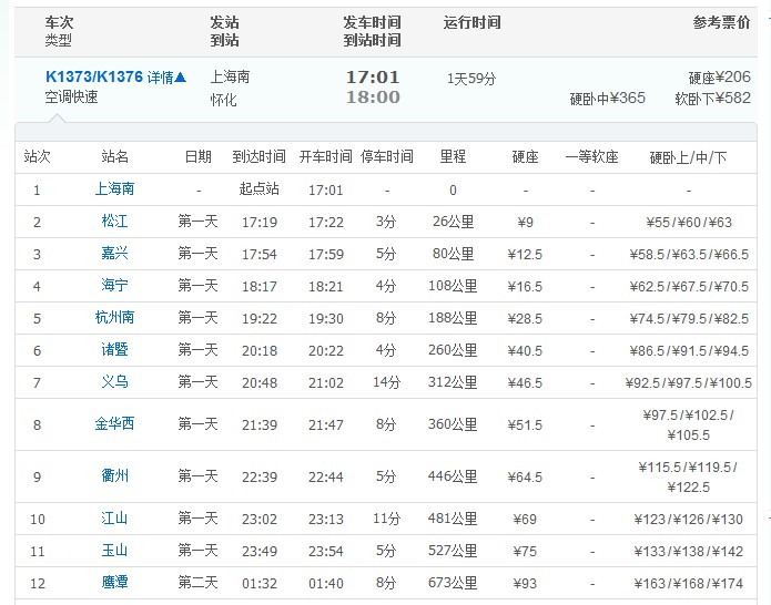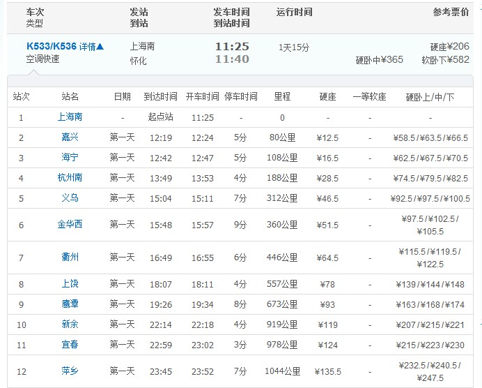 1、乘火車到張家界,上海南站有2班直達(dá)張家界的列車,一班為K533,從上海南站到張家界火車站,出發(fā)時(shí)間為11:25到第二天早上07:53,全程20小時(shí)28分;另一班K1373,是從上海南站到張家界火車站,出發(fā)時(shí)間為17:01出發(fā)到張家界為第二天13:59分,全程20小時(shí)58分;詳細(xì)列車時(shí)刻表為: