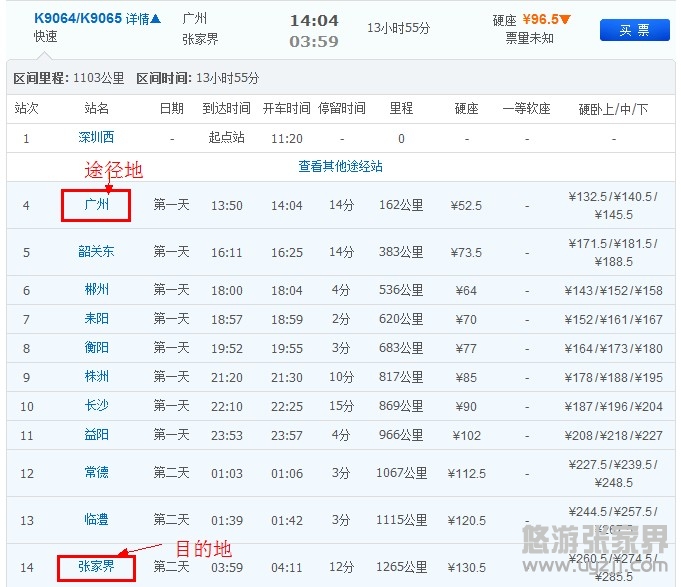 3、K9064次列車,起點站深圳西,途徑廣州,到達廣州時間為13:50分,目的地為張家界,途徑張家界為03:59分