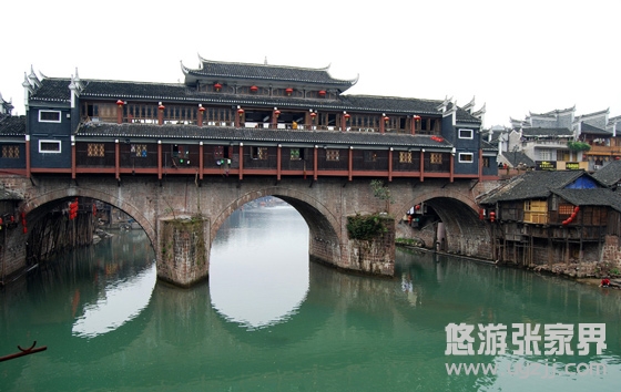 鳳凰古城的虹橋始建于明洪武初年,民國三年(1914年)、沱江漲了一次三百年一遇的大洪水,虹橋受到重創(chuàng),時任湘西鎮(zhèn)守使的鳳凰人田應詔,為了表現(xiàn)革命后的改革和新政,美化鳳凰古城,主持修復虹橋。2000年廣東中人企業(yè)集團公司投資承建虹橋,重新裝飾的虹橋在原來的建筑風格上更加完善。古色古香,樓為兩層。一樓有寬敞的紅巖板人行通道,24間木板店面經(jīng)營各種民問工藝品、雜貨、土特產(chǎn)品等。二樓為民俗文化樓,兩側(cè)為‘文化藝術長廊’中間為藝術回廊,還有一間茶室。